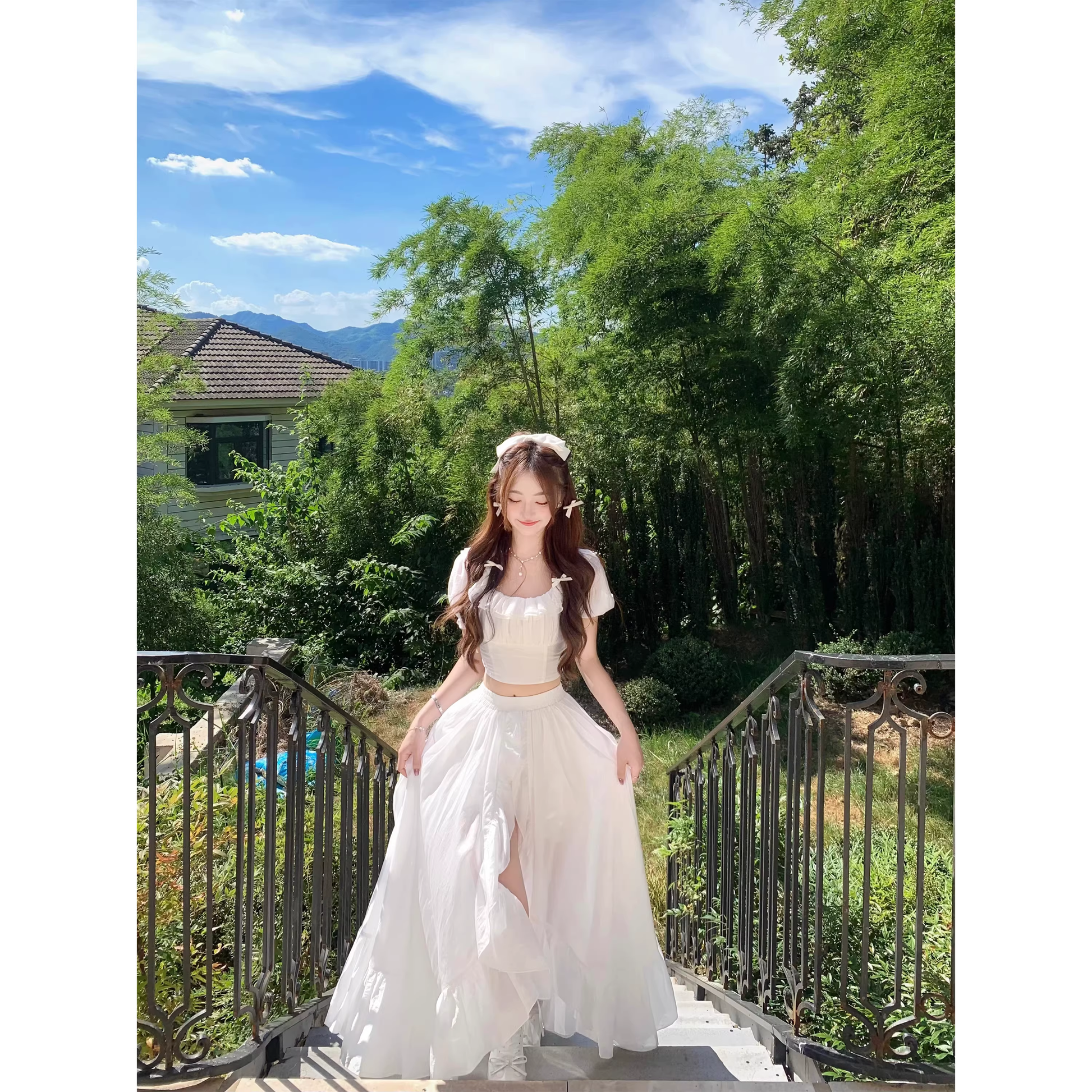 Pure white top and skirt set for summer A100