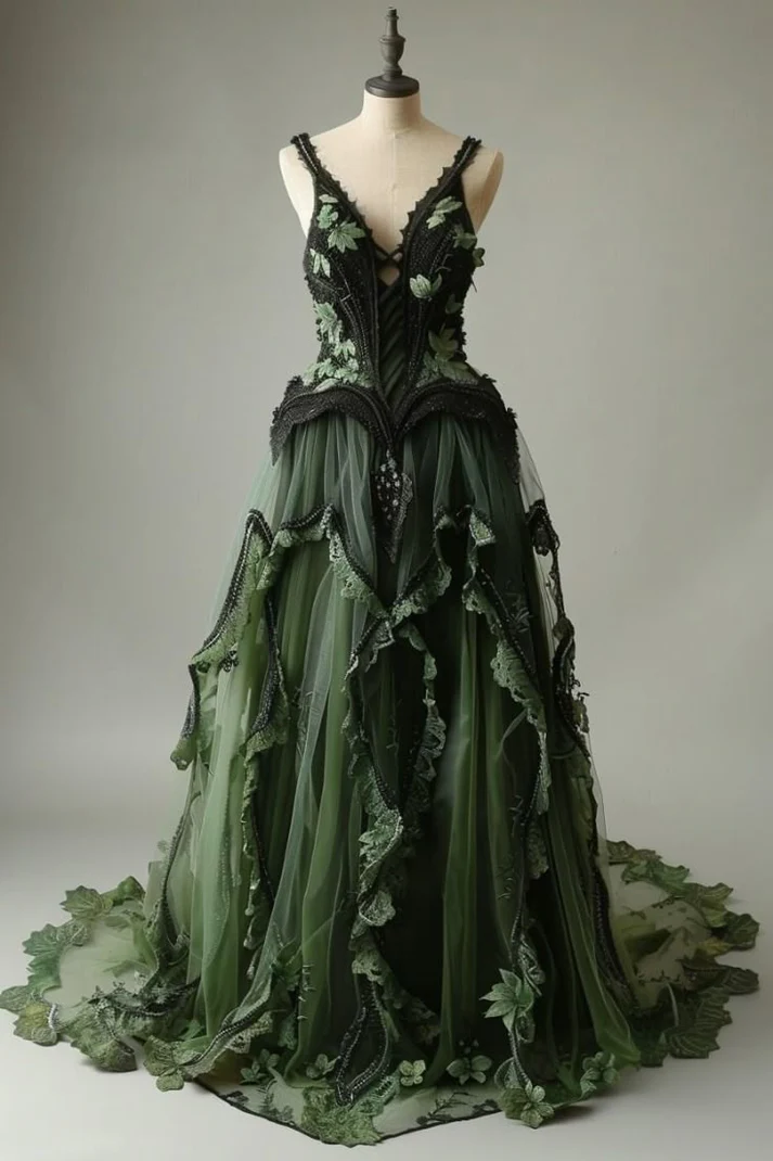 V-neck Tulle Applique Long Prom Dress Vintage Lace Formal Evening Dress fg8545