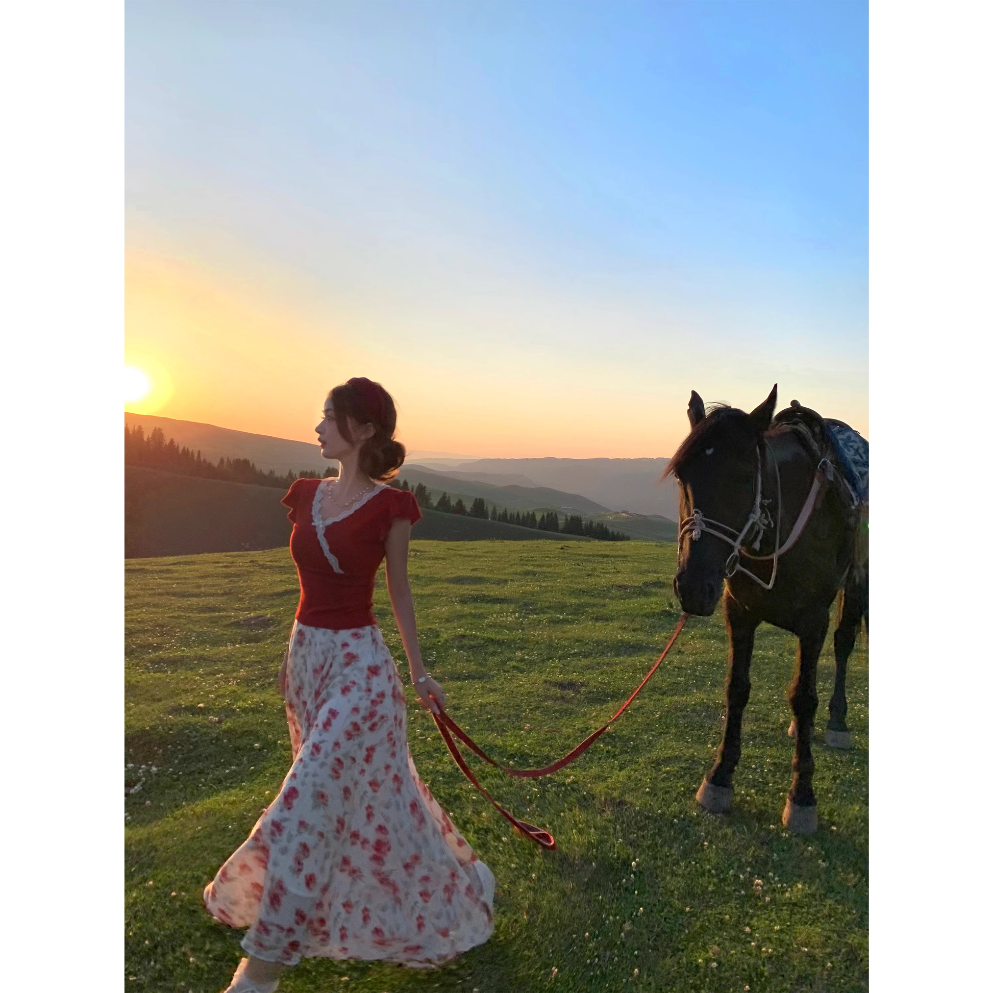 Red floral print midi skirt A117